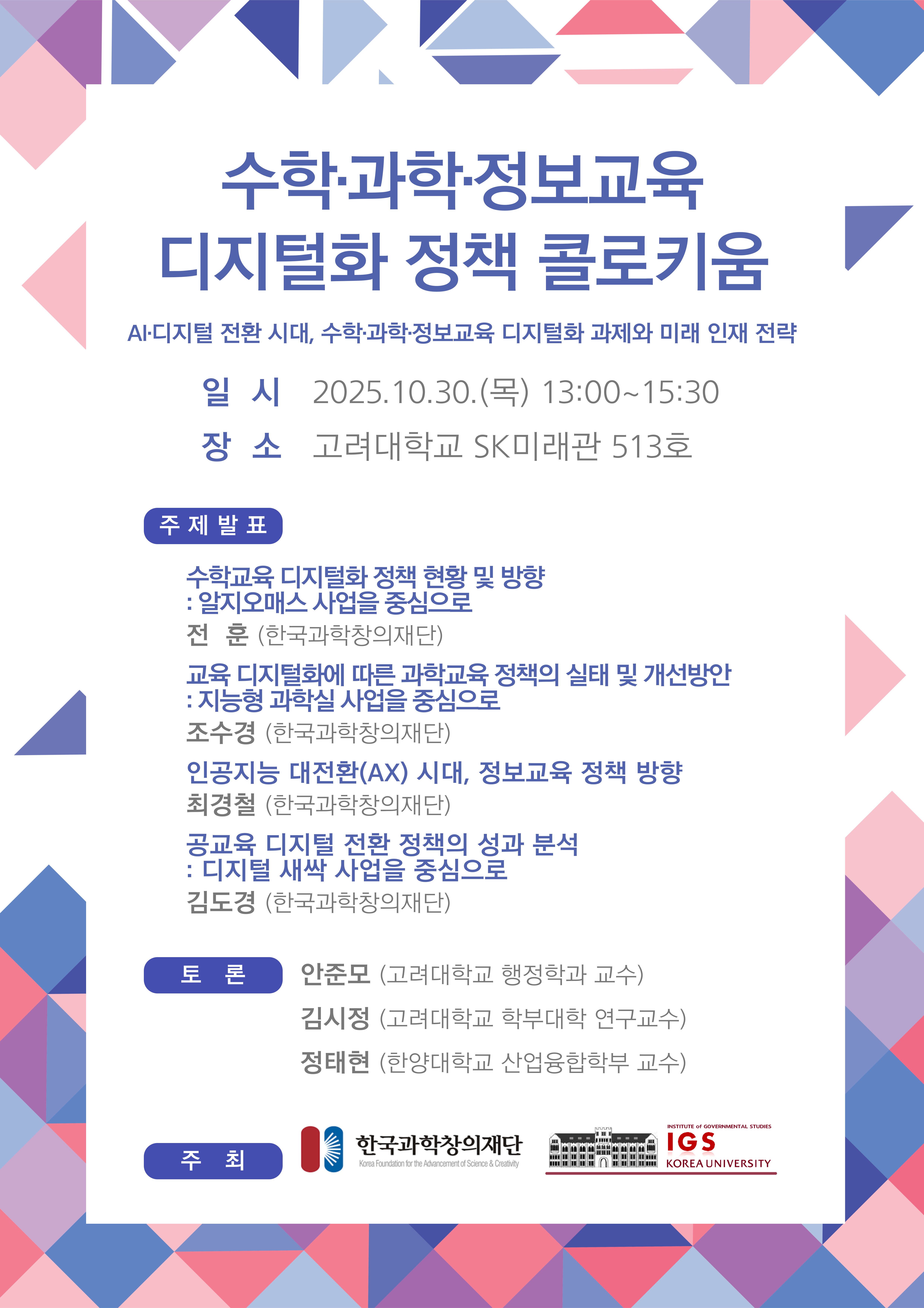 | 제목 | [정부학연구소-한국과학창의재단] 수학·과학·정보교육 디지털화 정책 콜로키움 |