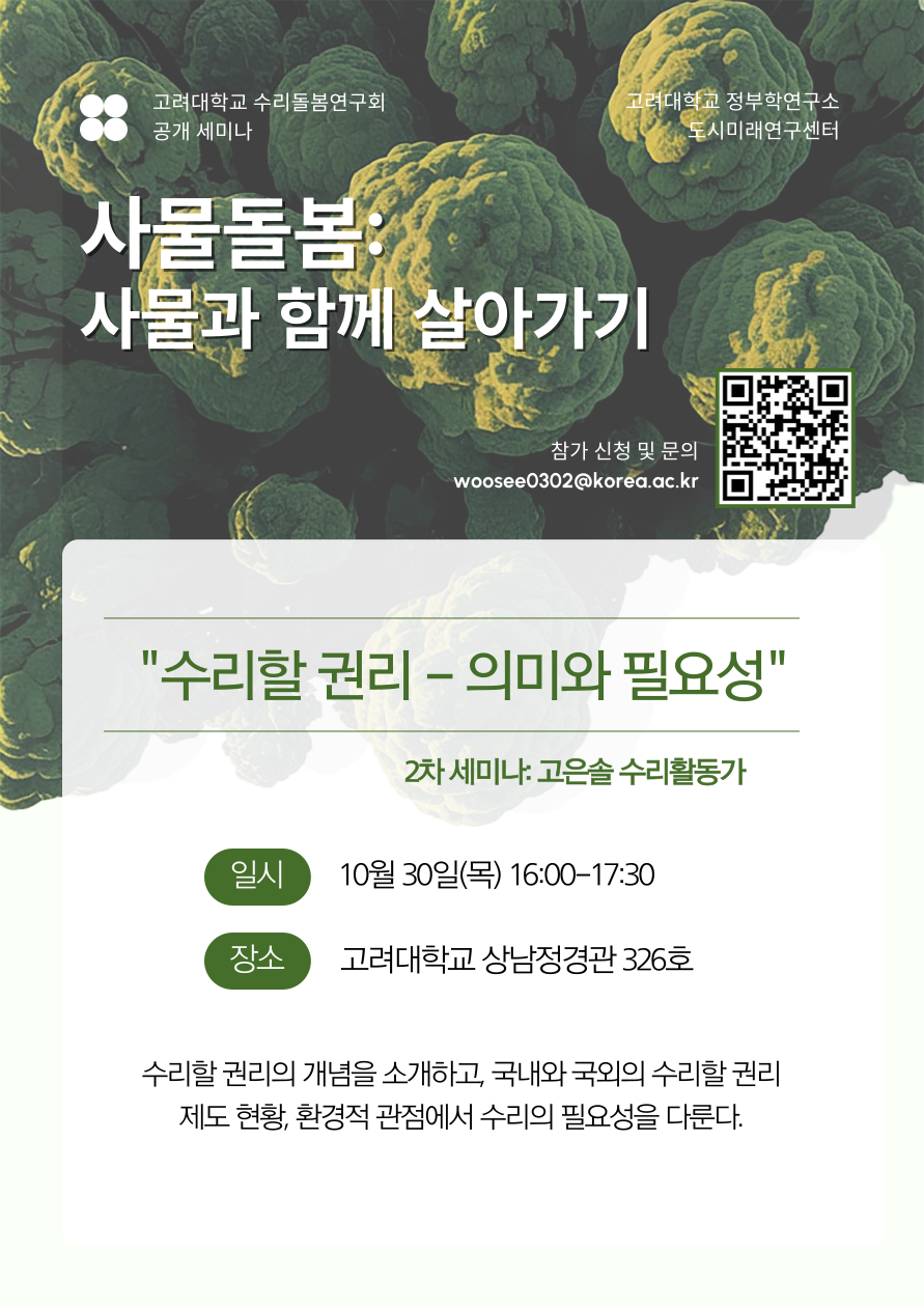 | 제목 | [고려대학교 수리돌봄연구회 X 정부학연구소 도시미래연구센터 합동 공개 세미나] 자원순환 넘어 사물돌봄 |