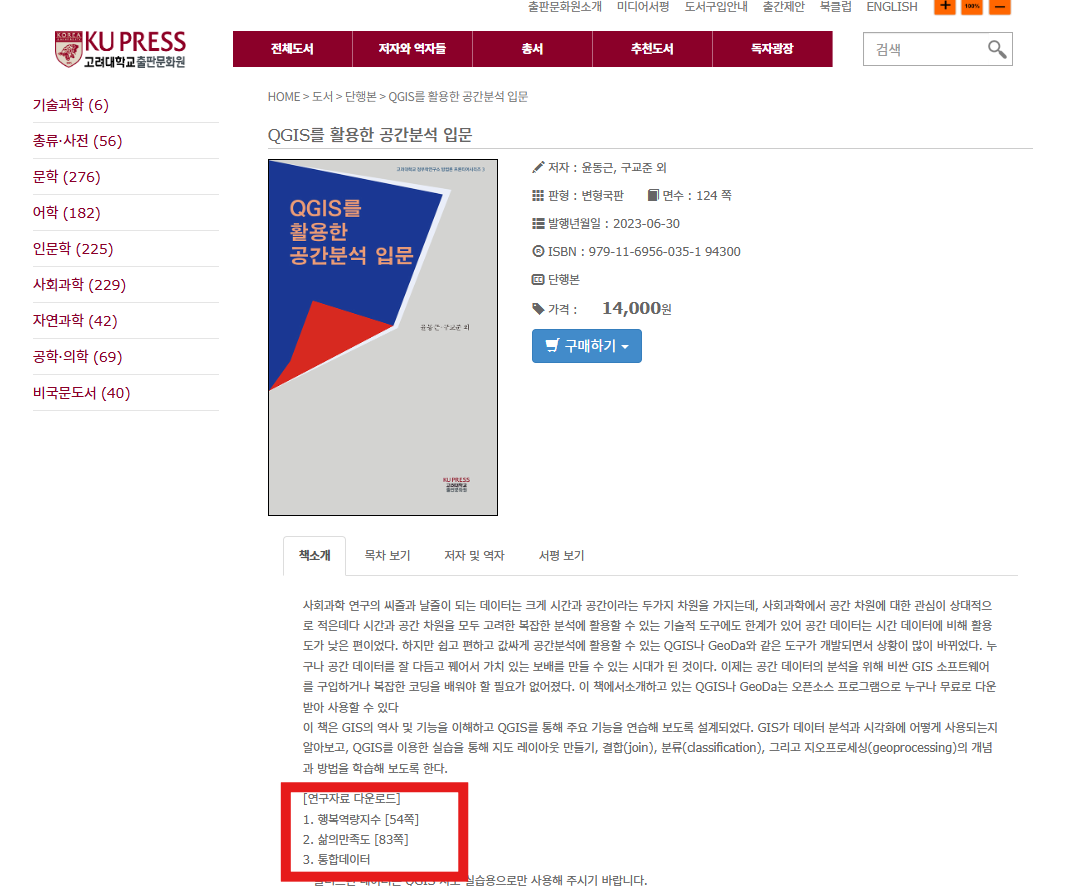 2023년에 정부학연구소에서 발간한 "QGIS를 활용한 공간분석 입문" 서적 내