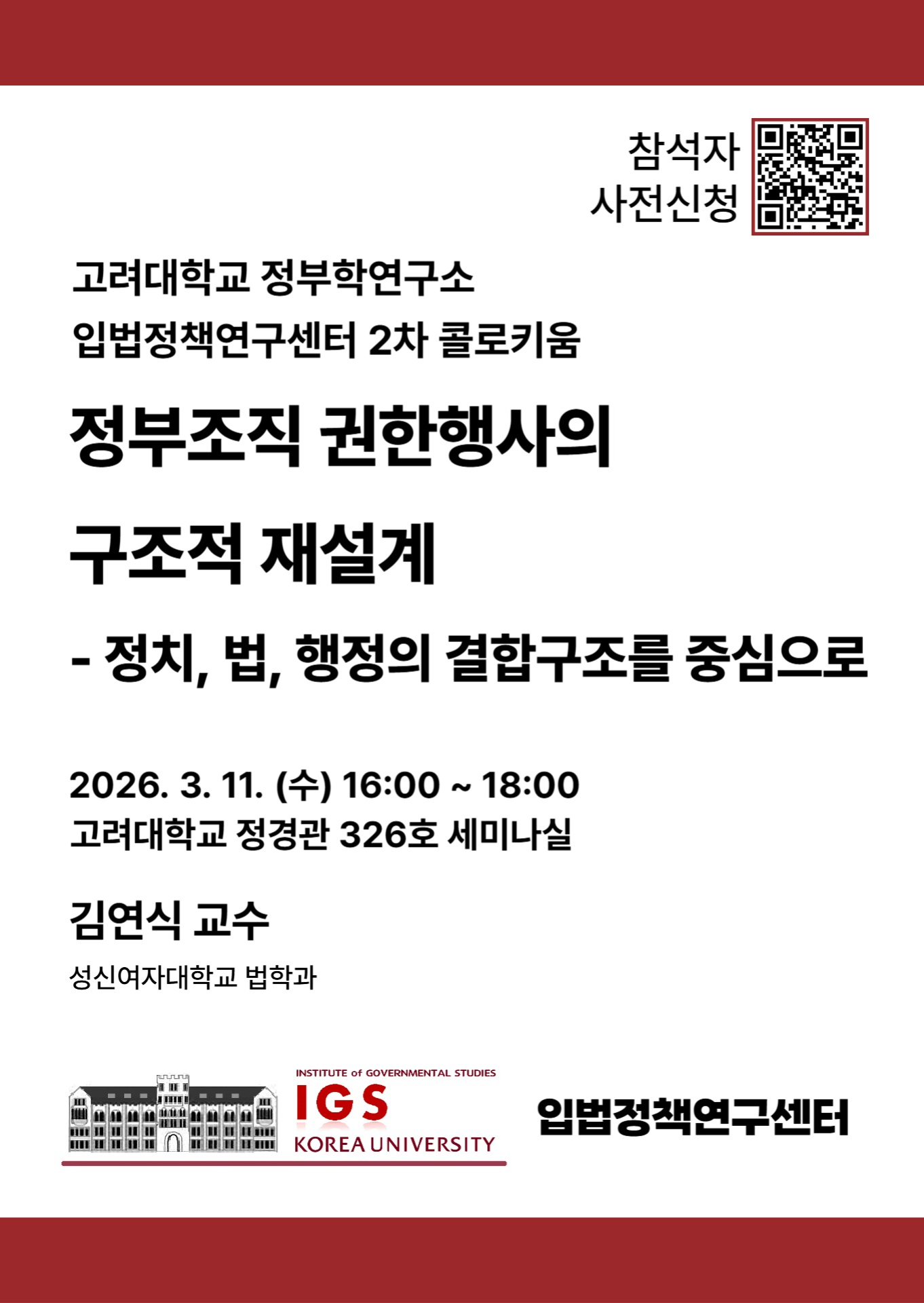 | 제목 | [입법정책연구센터 콜로키움] 정부조직 권한행사의 구조적 재설계 - 정치, 법, 행정의 결합구조를 중심으로 |
