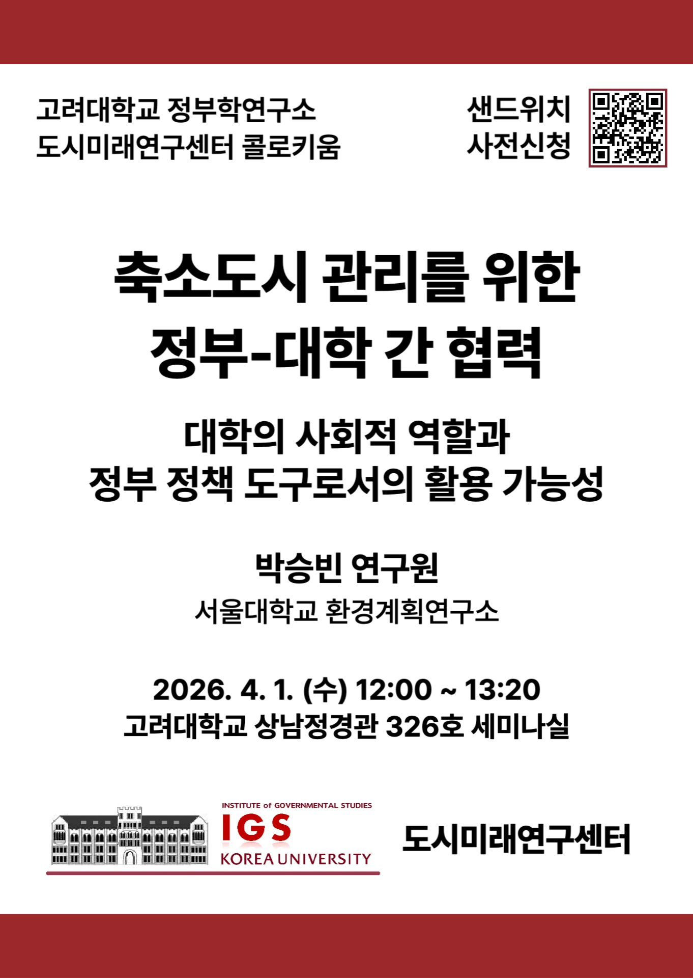 | 제목 | [도시미래연구센터 콜로키움] 축소도시 관리를 위한 정부-대학 간 협력: 대학의 사회적 역할과 정부 정책 도구로서의 활용 가능성 |